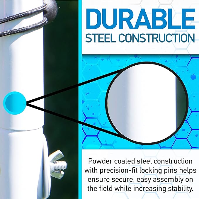 - DURABLE WHITE POWDER STEEL CONSTRUCTION: Powder coated steel construction with precision-fit locking pins helps ensure secure, easy assembly on the field while increasing stability.