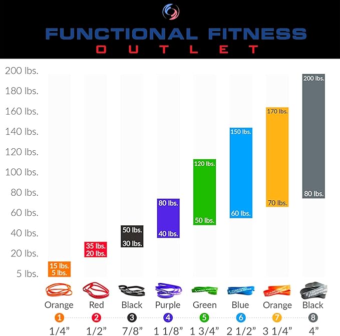 - STRENGTH LEVEL SPECIFICATIONS - These exercise bands comes with different resistance levels. Light 5-15 lbs, Medium 10-25 lbs, Heavy 30-50 lbs, Robust 40-80 lbs, Power 50-120 lbs, Strong 60-150 lbs, Monster 80-200 lbs. Perfect for anyone from beginners to advanced users, these bands will help you enhance your fitness training.