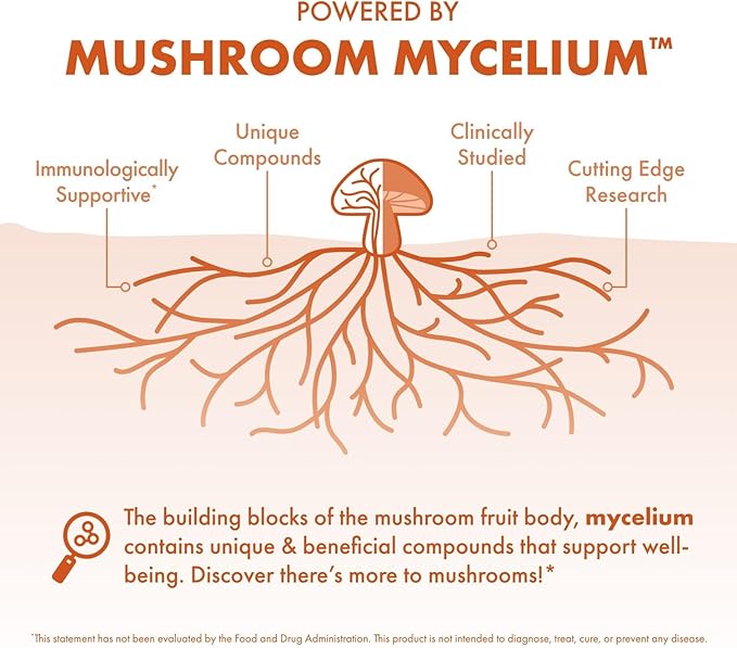- Powered by Mushroom Mycelium: Our organic mushroom mycelium is grown on organic brown rice substrate; third-party studies show that mushroom mycelium and fermented rice substrate support your health*