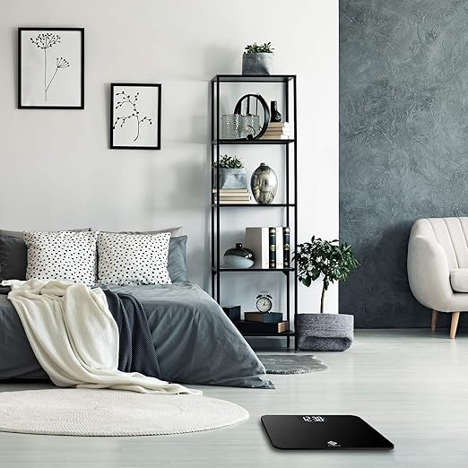 - Easy to Use & Round Corner Design-Immediate readings as soon as you step on the bathroom scale; Auto-off , Auto-zero, Auto-calibration; Low battery and overload indication; measures in both lb and kg, Sleek-looking rounded corners spare household members from sharp edges