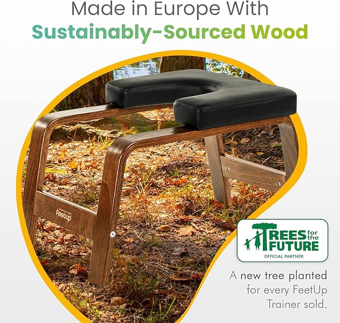 - Made with Earth-Friendly Materials - FeetUp’s headstand inversion bench won’t just benefit you. It’s good for the environment, too. These yoga inversion chairs are composed of sustainable vegan leather and dark or light beech wood.