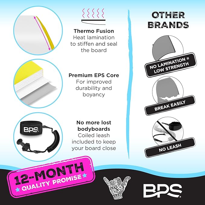 - EXPECT HAPPY FACES AND LIFELONG MEMORIES 🤗 Designed for Performance the BPS 'SHAKA' Bodyboard is an Ultra lightweight board with a slick, high-speed bottom surface, an EPS core for improved buoyancy, bottom rear channels, and a crescent tail. You will experience perfect balance, maneuverability, and speed in all wave conditions, and of course, our size chart makes sure you can select the perfect board for every rider. Want body boards for beach days? We’ve got you covered.