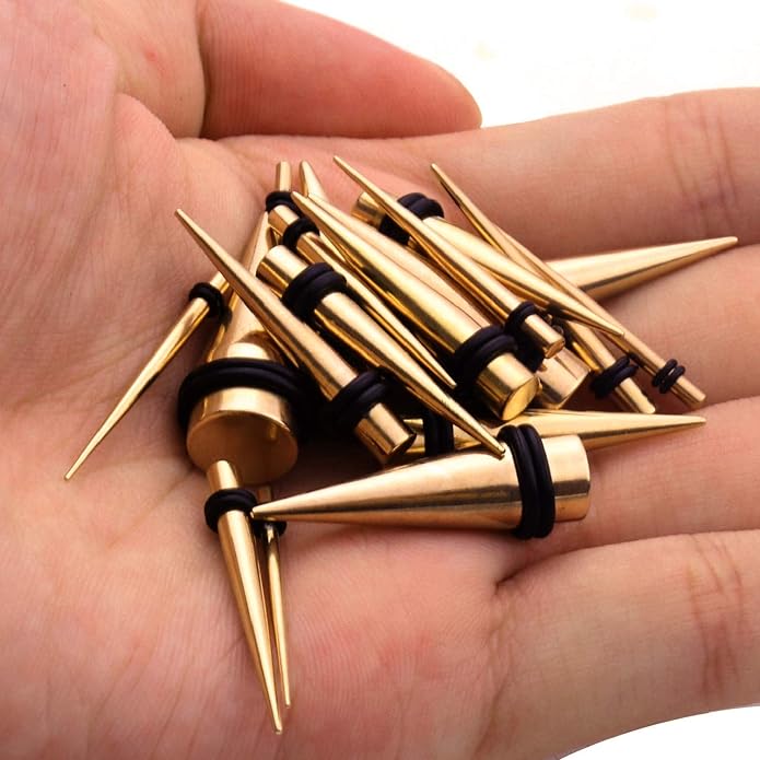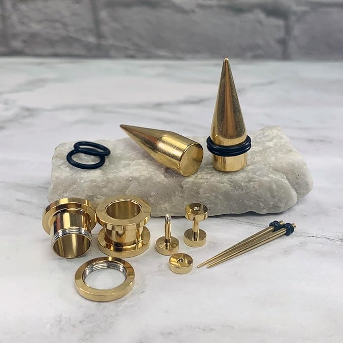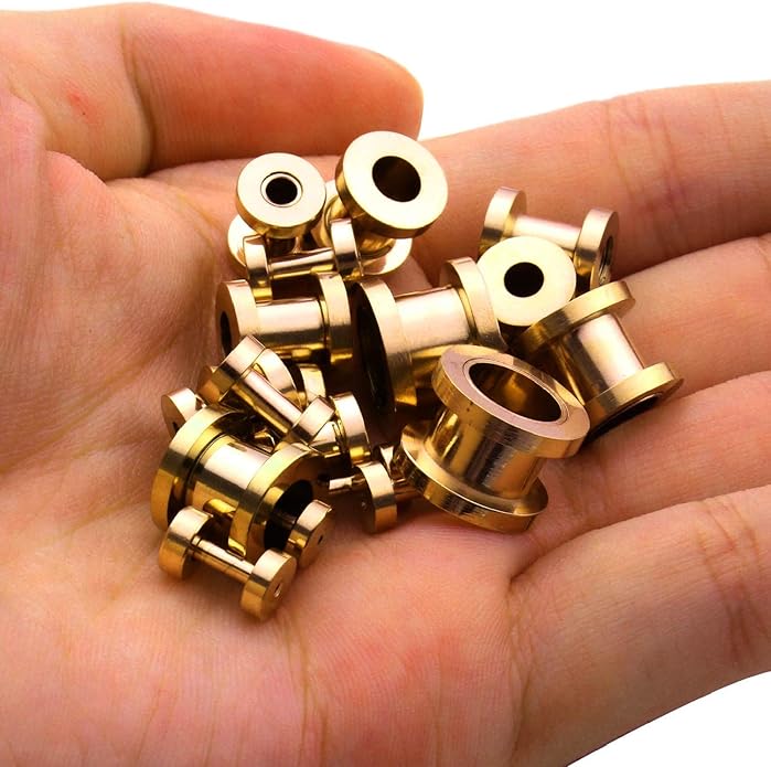 - VERIFIED SIZES: Tunnels, Tapers (O-Rings Included): 14G (1.6mm), 12G (2mm), 10G (2.4mm), 8G (3.2mm), 6G (4mm), 4G (5mm), 2G (6mm), 0G (8mm), 00G (10mm). COLOR: Goldtone. SCREW FIT: Threaded Flesh Tunnels Unscrew at One End. Easily Insert Into Your Ear and Screw Back