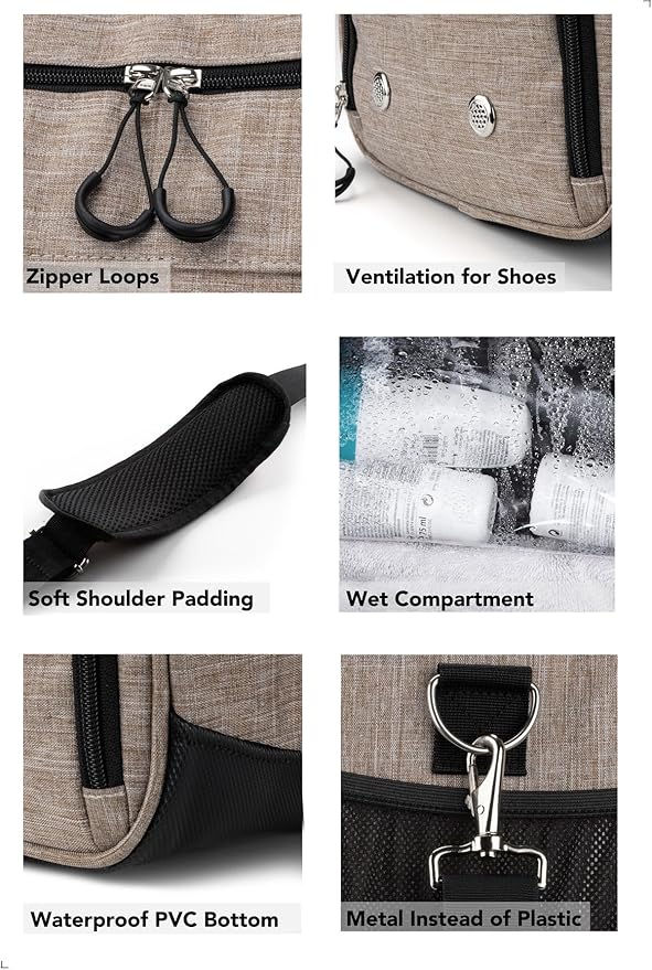 • 6 SEPARATE POCKETS: 1 spacious main compartment with a small inner pouch. 1 waterproof wet pocket, 1 breathable shoe pocket, 1 medium-sized front pocket, and 1 side mesh pocket.