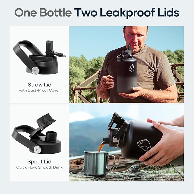 - 2 Lids to Max Its Usability: This half gallon stainless steel bottle comes with a straw lid and a flex cap to gear up your games and explorations. Both caps can seal airtight with 100% leak-proof, so you can drink without a spill on the road. *NOTE: ONLY the 22oz and 32oz T-shape bottles fit in any cup-holders*