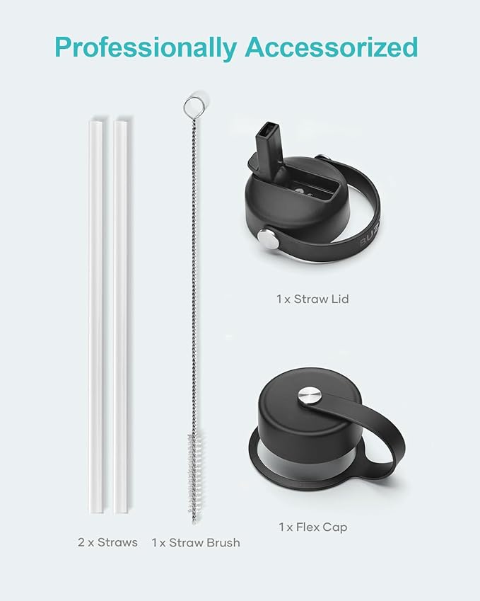 - What You Get: Included with a BUZIO insulated water bottle, a straw lid (2 straws), a flex cap, and a cleaning brush.