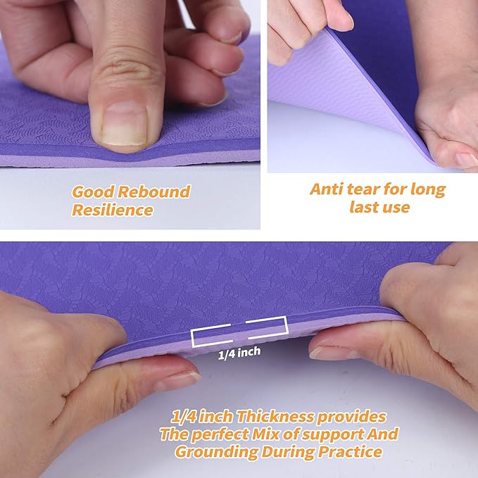 • 🧘‍♀️【Durable and Spacious TPE Yoga Mat】Our yoga beginners kit includes a premium TPE yoga mat with double-sided non-slip surfaces and two color options. Measuring 72"L x 24"W, it provides ample space and a 6mm (1/4in) thick for optimal comfort and support. The fast rebound technology reduces impact force, protecting your joints while maintaining stability.