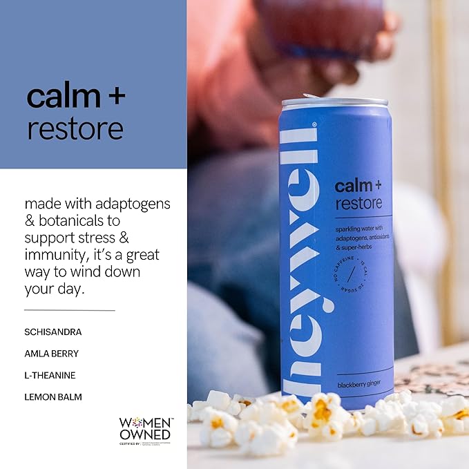 Heywell Sparkling Adaptogenic Water Calm and Restore, Blackberry Ginger Flavor 12 Fluid Ounce (Pack of 12) - Non Caffeinated, Organic, Non GMO, Vegan, Gluten Free, Dairy Free