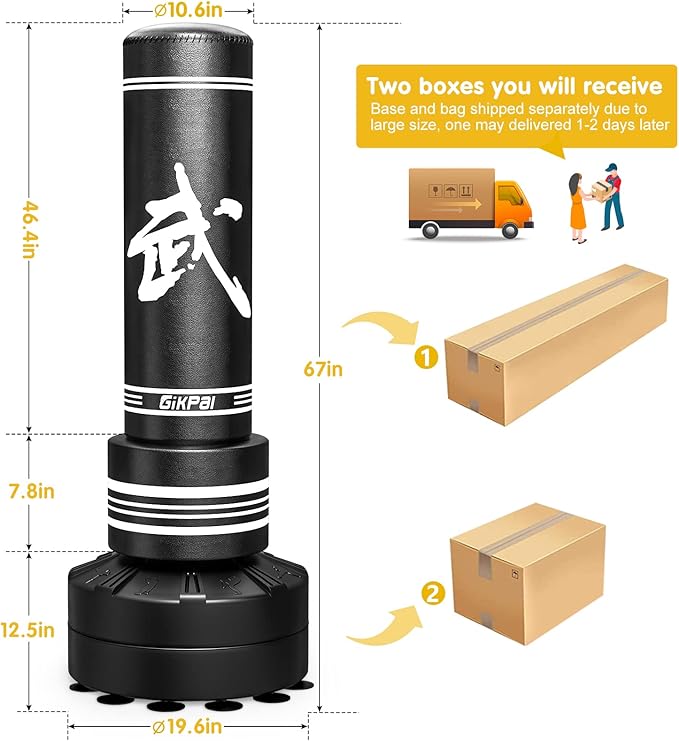 - [FREESTANDING PUNCHING BAG] Say goodbye to your old hanging punch bags, no need to drill or hang, GIKPAL punching bag works on any even floors in home and office, take up very little floor. Stands approx 67’’/170cm high, punching bag for adults about 47’’-70’’ tall.