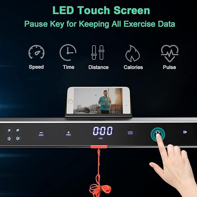 - 𝗦𝗶𝗺𝗽𝗹𝗲 𝗢𝗽𝗲𝗿𝗮𝘁𝗶𝗼𝗻: This under desk treadmill features LED touch screen, offering real-time feedback of calories, pulse, time, distance and speed. The treadmill could also be control and adjust via App and remote. Furthermore, all sports data will be kept when you press the pause key for water break and you can switch speed unit between mile and km in APP.