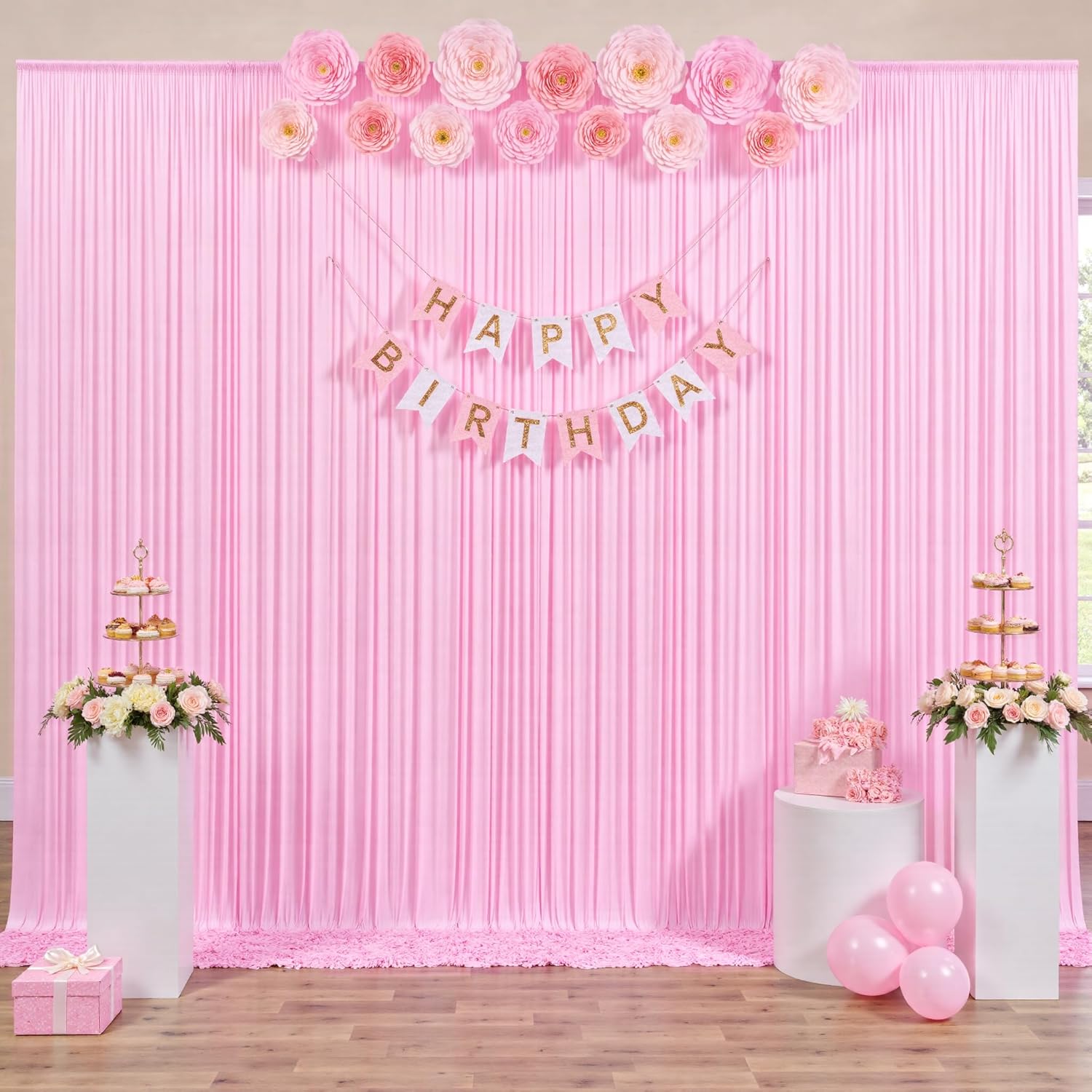 - Baby Shower Pink Curtain Drapes Make Your Party Pops:You can add some flowers,greenery,balloons, party streamers, fun banners, balloon arch, butterflies, paper stars, tissue paper flower prop, confetti,twinkle lights to make your polyester backdrop for a gorgeous look! Light Pink backdrop stand drapes for wedding can be hand wash or machine wash.