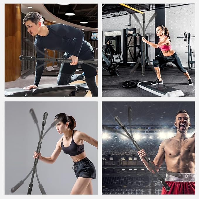 - Scientific counterweight design: the fitness bar has an ergonomic handle, a more comfortable handle, multiple exercise angles, suitable for both hands and one hand, a scientifically weighted small iron block, reaches the appropriate vibration frequency, an elastic training rod for training and increases balance with flexibility, rely on the fat repeller bar to burn calories