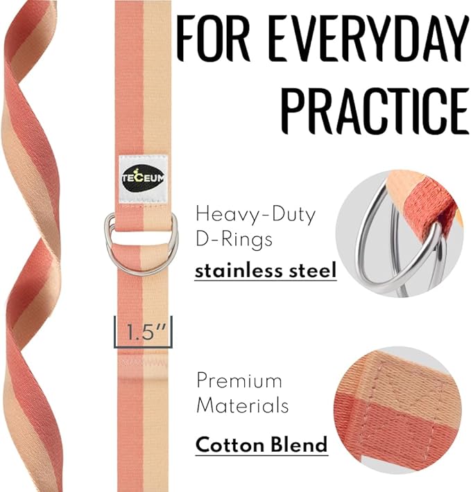 - STRONG & COMFY: Our yoga belts are made from high-quality cotton blend with eco-friendly yarn dyeing. It is non-elastic, durable and easy-to-clean material. The thick tight weave yet delicate soft-to-skin texture of the belt ensures both durability when carrying the mat and comfort during and comfort during practice. The D-ring loops are made from sturdy corrosion-resistant stainless steel and holds the yoga strap.