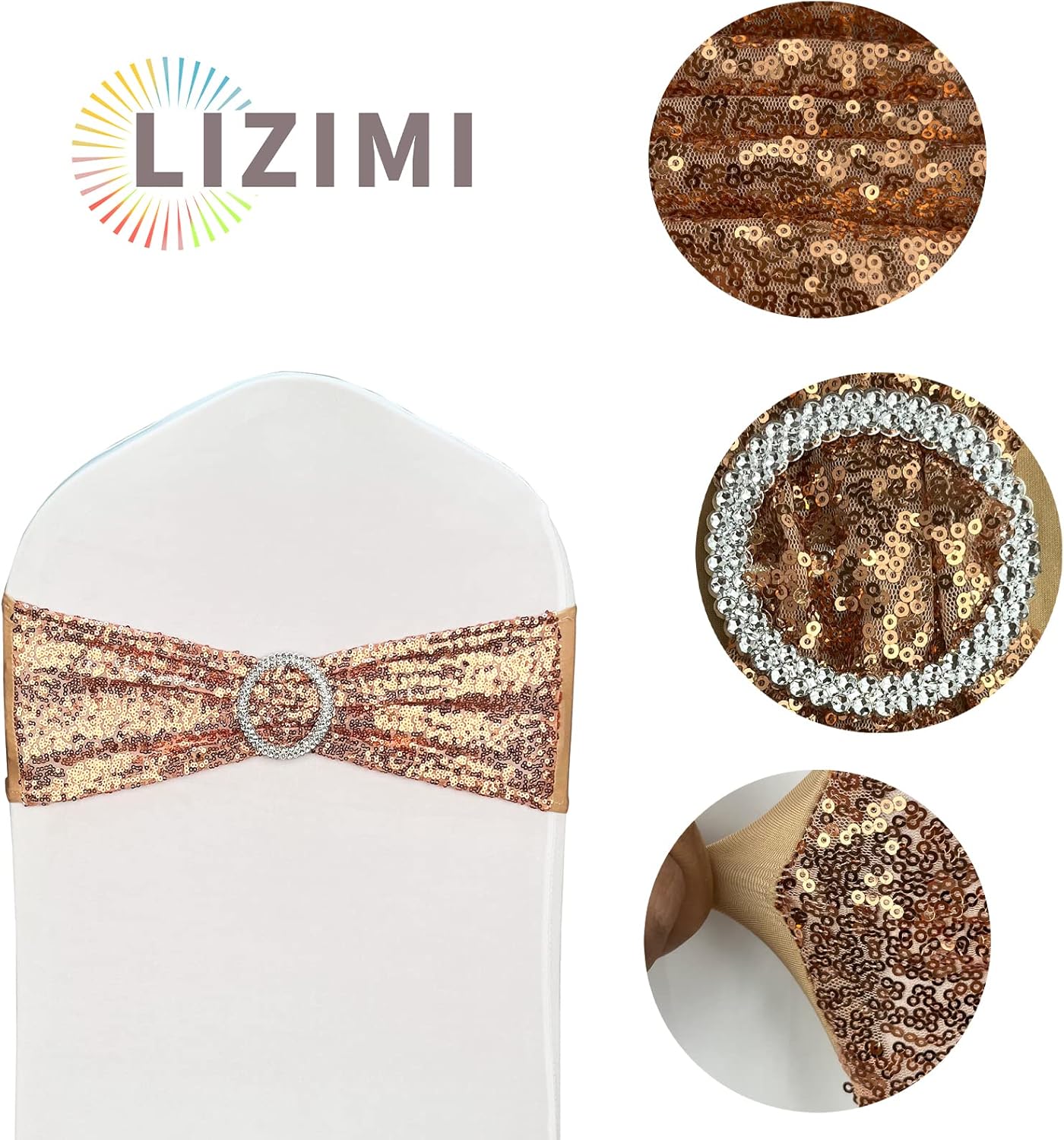 10 Pcs Sequin Chair Sashes Stretch Chair Bands Spandex Polyester Bows for Party Hotel Wedding Banquets Decoration - Rose Gold