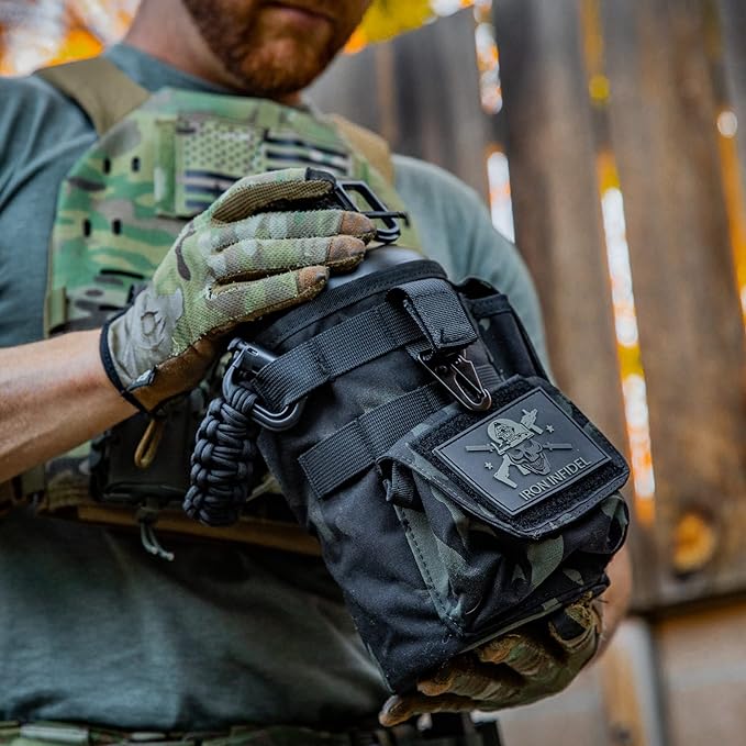 - PATENT PENDING DESIGN - This unique and original design is the only one of its kind. Iron Infidel created and patented this original design with our military, law enforcement, first responders , and hard working patriots in mind. These men and women put in long, hard days and a petite water bottle just won't cut it. Stay hydrated all throughout your hardest days, and you might as well do it with a bottle that looks cool. Grab the 21st century replacement of your old military canteen.