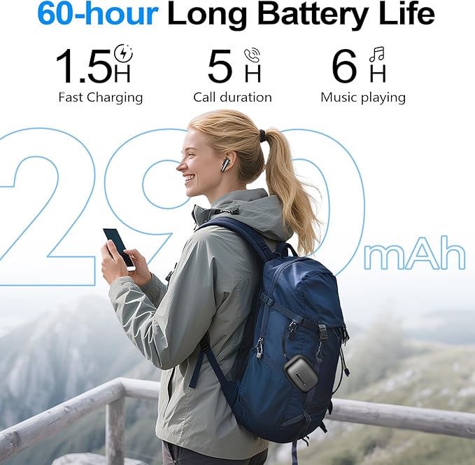 - 60 Hours Battery Life for Uninterrupted Listening:Say goodbye to battery anxiety! Enjoy 12 hours of non-stop playback on a single charge, extended to 60 hours with the compact charging case. Commuting, workouts, or travel—your music and calls never stop. With fast charge, just 10 minutes of charging delivers 2 hours of playtime, so your rhythm never break