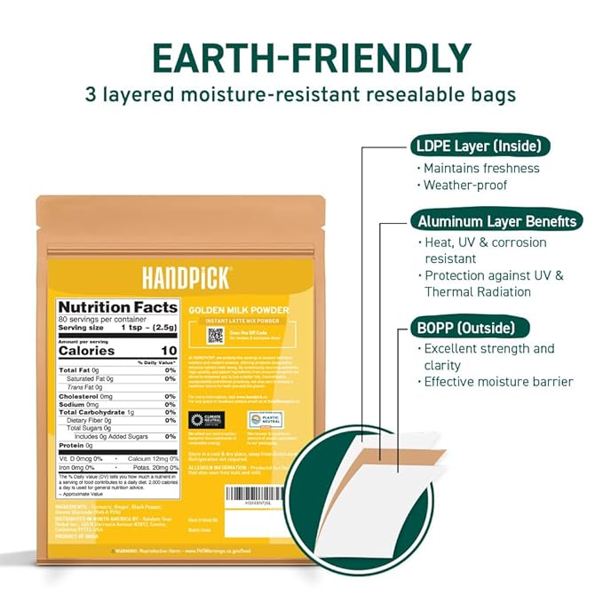 HANDPICK Golden Milk Powder with Turmeric - (7oz, 80 servings) Instant Latte Mix | Blend of Ginger, Black Pepper and Curcumin