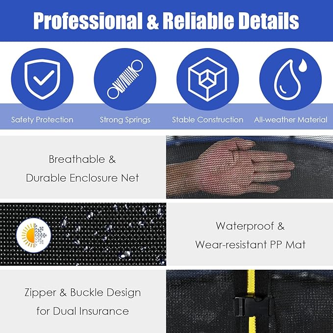 • 360-Degree Enclosure Net w/ Buckle & Zipper: The trampoline features the 6 FT high all-round enclosure net, which is UV, fade resistant and tear-resistant. Combined with the buckle and zipper double lock system, it adds additional safety for jumping.