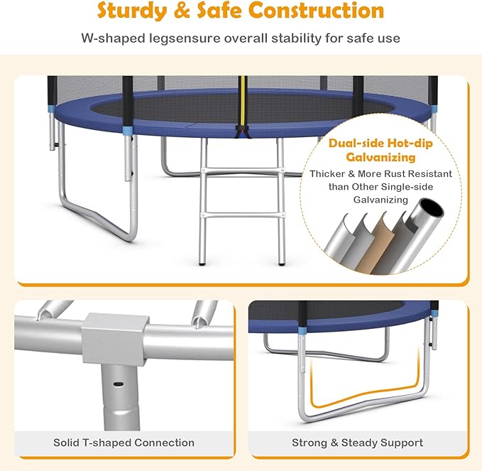 - Sturdy & Durable Construction: The trampoline for children and adults is crafted with galvanized steel frame, which is characterized by great rust resistance and durability. Foam covered on the frame can effectively prevent corrosion to ensure long-term outdoor use. Moreover, the legs strongly support the trampoline to make you jump in a more stable condition.
