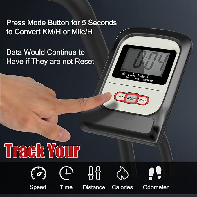 - 【Clear LCD Digital Monitor】 In order to feedback your exercise data in real time, this fan bike is equipped with a clear LCD display, conveniently tracking your time, speed, distance, calorie and total distance. Besides, you can press the mode button for 5 seconds to convert km/h or mile/h for your preference. And the device holder allows you to put your phone or tablet with ease.