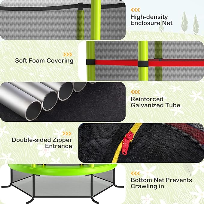 - All Round Enclosure Safety Net: The enclosure safety net of this toddler trampoline is installed inside, protecting kids from getting their hands or feet stuck. Its see-through design also allows you to keep an eye on them conveniently. The entrance provides easy access to trampoline and double-side zippers offer extra protection.