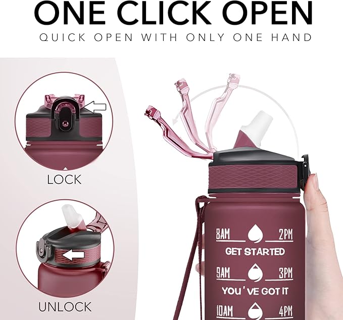 - Functional Design: The bottle with straw allows for spill-proof sipping; The flip-top lid has a secure lock leak and can be opened easily with one hand; The wide mouth fits ice and is easy to clean.