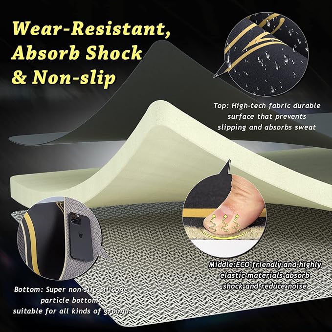 - Noise-Reduce Durable Surface: The top of the our thick fitness mat use the new patented fabric to help absorbs harsh noise when jumping ropes. These high quality surfaces will absorb sweat and help you keep safe during your workouts. Anytime your mat is wet with sweat, no need rag, just a while to evaporate quickly.(In case of a large amount of water, please hang it up and wait patiently for a while.)