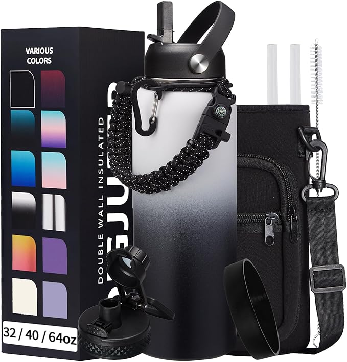- COMBO—Super Deal: Buy 40oz stainless steel water bottles and get 9 accessories (2 x lids, 1 x survival paracord, 1 x carrying pouch, 1 x shoulder strap, 1 x protective cup mat, 2 x straws, 1 x straw brush). WITH A LIFETIME GUARANTEE, these thermal water bottles are the perfect gift for use at home, work, school, road trips, hiking, sporting events, or just hanging out