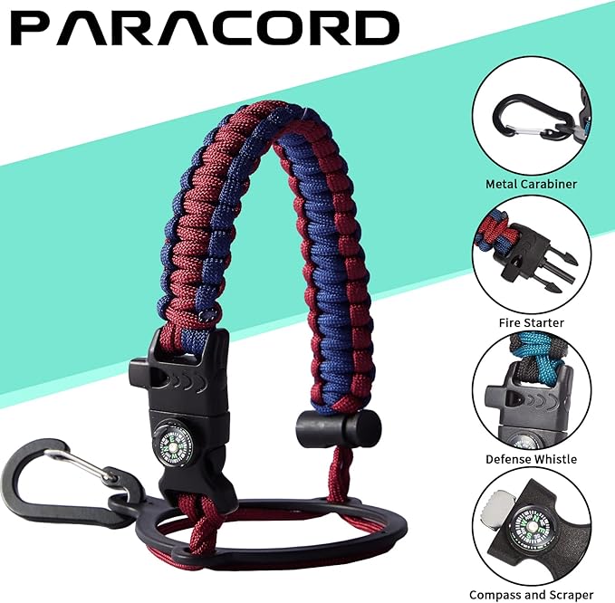 - UNIQUE PARACORD—Perfect Accessories: bright color paracord matches the flask water bottle to give you a youthful vibe while adding a personal style. It comes with a compass, safety loop, metal carabiner, flint, igniter, and whistle to become your survival tool for your wild adventures