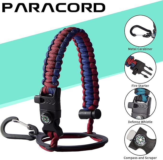- UNIQUE PARACORD HANDLE: Bright color paracord matches the flask water bottle to give you a youthful vibe while adding a personal style. With a compass, safety loop, metal carabiner, flint, igniter and whistle to become your survival tool, making the 32 oz stainless steel water bottle with paracord an ideal survival kit for expeditions in the wild