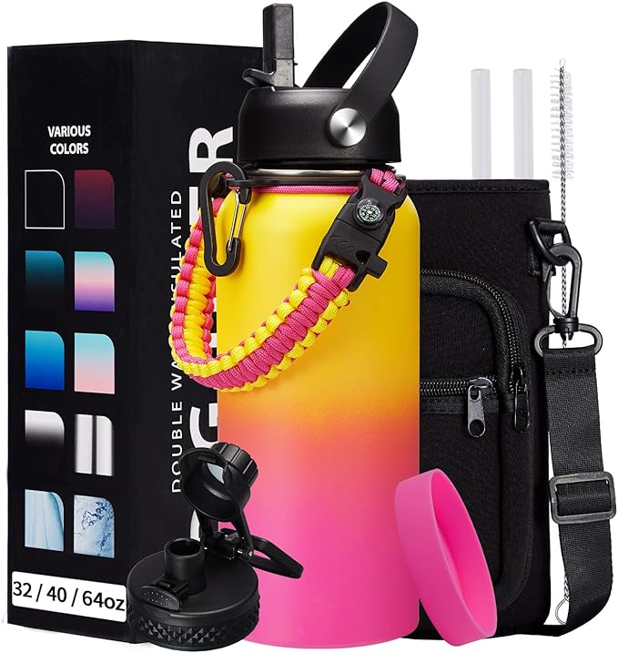 - SUPER JOYFUL COMBO: Buy 32oz insulated water bottles and get 9 accessories (2 x lids, 1 x survival paracord, 1 x carrying pouch, 1 x shoulder strap, 1 x protective cup mat, 2 x straws, 1 x straw brush). WITH A LIFETIME GUARANTEE, these thermal water bottles are perfect gifts for using at home, work, school, road trips, hiking, sporting events, or just hanging out