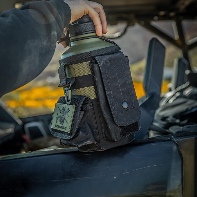 - REMOVABLE COVER - Made from military grade rip and tear resistant fabrics. The nylon cover is removable, washable, and has two utility pouches for your cellphone, wallet, keys, and other belongings, and a removable paracord carry handle. Covers can be interchanged between all Iron Infidel 2 liter bottles.