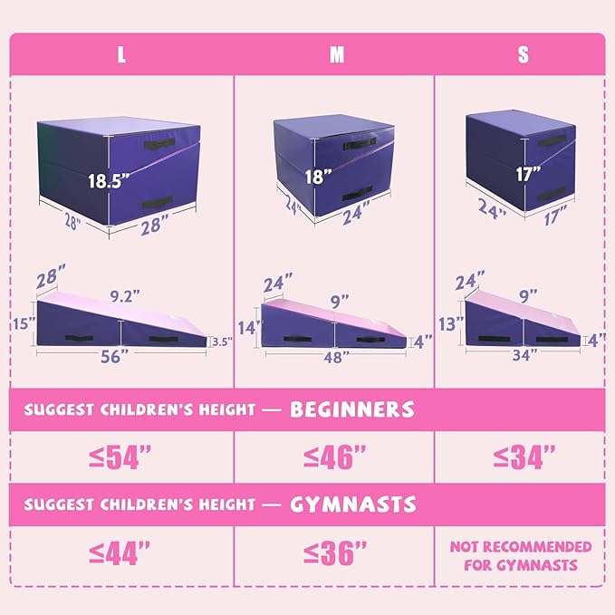 - COMFORTABLE & FIRM STUFFING BRINGS ETERNAL SECURITY: Kangaroo Hoppers cheese mat is dedicated to safety. Folded size of L: 28"x28"x18.5"(L x W x H). Unfolded size 56"x28"x15" (L x W x H). Suggested children’s height is shorter than 54". Suitable for young gymnasts and allows for a variety of skills training. You feel stable and comfortable on this gymnastics wedge mat. And high-density EPE foam won’t go out of shape after long-time use.