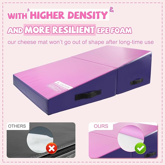- FOLDABLE DESIGN WITH 4 HANDLES, EASY TO CARRY & STORE: Each side and every handle with excellent craftsmanship will never unravel. Simply turn the gymnastics mat from a cube to a wedge or from a wedge to a cube by opening and folding it. You can take the incline mat with you to the backyard, park, or gym and store it at any place in your house when not in use.