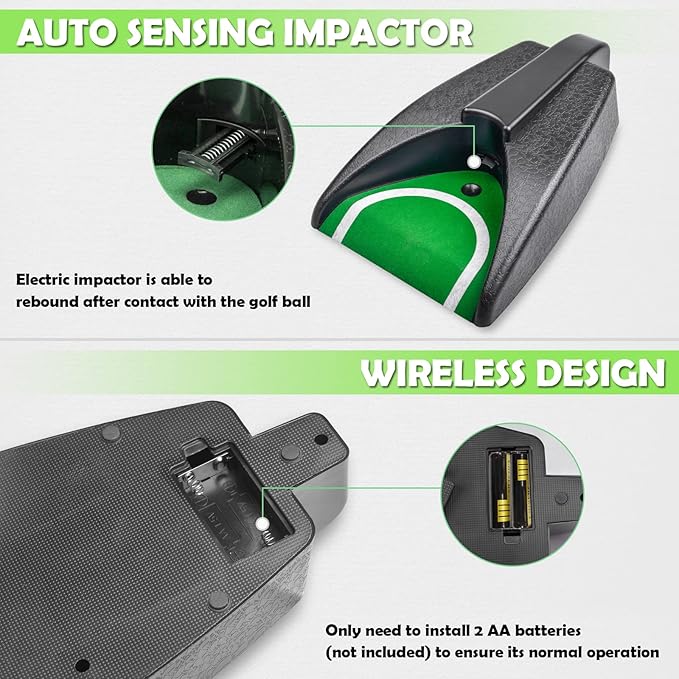 - 【Battery Control】The golf putting machine runs on batteries, which means you don't need to worry about cords or outlets. By simply inserting two AA batteries, you can practice your putting indoors or outdoors.(Not included battery)
