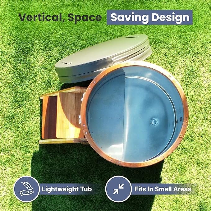 - [Easy to Use]: Ice bath ships fully assembled, so you can begin enjoying cold plunge therapy right away; a water outlet is included inside the ice bath; simply press down on the outlet to drain the water; red cedar steps make it easy to get in and out of the tub; insulated cover helps keep water cool and clean in-between uses