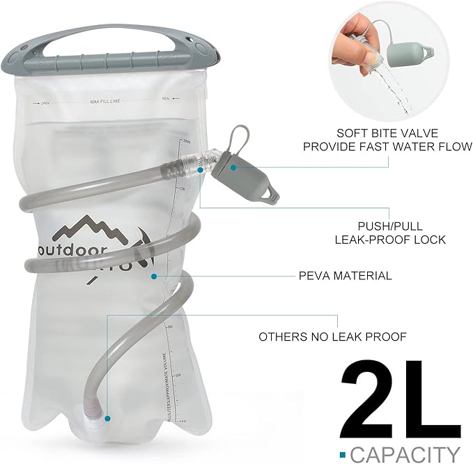 - 🚴【Premium Quality Water Bladder】The Hydration Pack Backpack comes with a 2 liter hydration water bladder and two 250ml soft flask. A switch valve and a cover cap make double leak-proof. Large opening allows quick filling of water and ice and it is easy to clean, the water line (40"length,0.4"diameter) provides a wholesome flow for easy drinking keeps your water tasting fresh, all day. The water temperature is range -20~+50℃.
