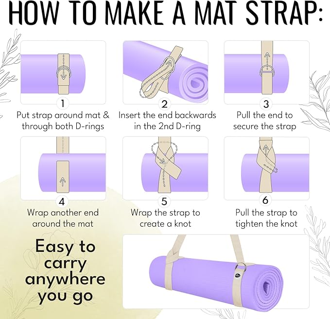 - STRONG & COMFY: Our yoga belts are made from high-quality cotton blend with eco-friendly yarn dyeing. It is non-elastic, durable and easy-to-clean material. The thick tight weave yet delicate soft-to-skin texture of the belt ensures both durability when carrying the mat and comfort during and comfort during practice. The D-ring loops are made from sturdy corrosion-resistant stainless steel and holds the yoga strap.