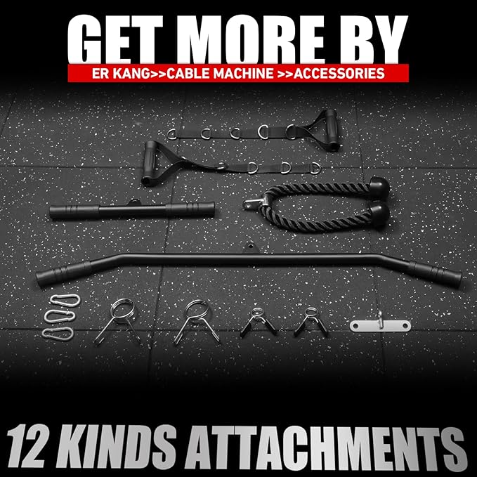 - 【DESIGNED FOR HOME GYM】Big footboard on the Base-perfect attachment for the seated cable row. Upward 10° of Weight peg can prevent weight plates slip off. It also comes with detachable sleeves to fit 1''/2'' plates. Special four buckles strap handles can let you easily adjust the length you want. Also, this machine comes with 3 additional attachments: Lat bar, Cable bar, and Tricep rope.