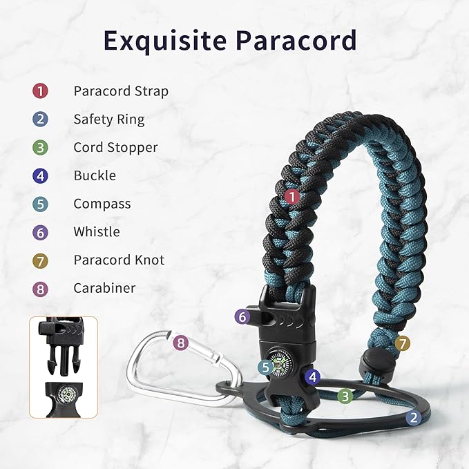 - Full-function Paracord Handle: 40 ounce water bottle come with paracord handle the brilliant paracord of matching colors bring out the bottle with a touch of youthful vibe. Compact compass and handy carabiner make the bottle the ideal survival kit for expeditions in the wild.