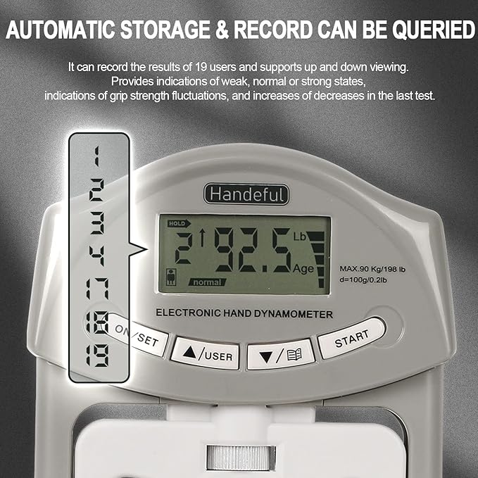 - [Multiple Profile Tracking] - Great for youth and adult sports teams, the compact grip trainer stores up to 19 user profiles complete with gender and age for easily tracking progress. The unit also recalls the last record grip strength test for each profile and visibly indicates whether the current test shows an increase or a decrease in hand strength.