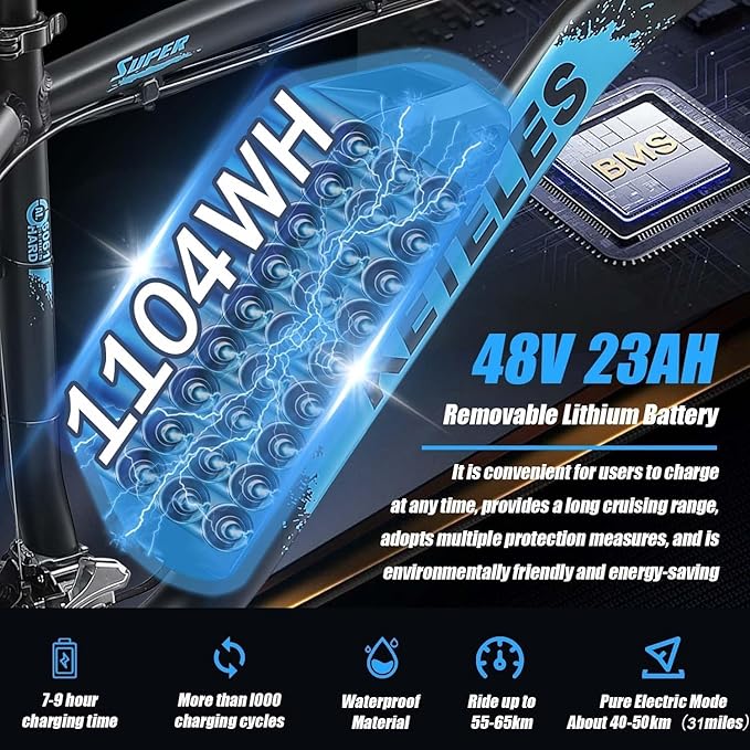 - 【High-Performance Battery】: The K800 bike is equipped with a high-capacity removable 48V 23AH battery with a total capacity of 1104WH. Depending on the load and terrain, the range in pure electric mode can reach about 40-50Km, and the range in electric assist mode can reach about 80-100Km. Our adult electric mountain bike is equipped with a 7-9 hour fast charging system and a meter that displays real-time battery power, allowing you to get on the road quickly, perfect for long-distance riding