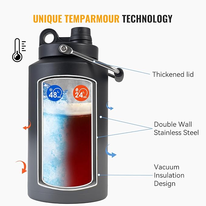 - 💧VACUUM INSULATED: Double layer vacuum insulated kettle, keeps the liquids icy for up to 48 hours or piping hot for up to 24 hours.This gallon water bottle is made of Powder-coat sweat-free technology, bottle grabbing becomes easy in time after strenuous exercise.