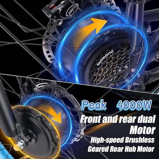 Electric Bike for Adults, AWD Ebike Dual Motor, 26'' Fat Tire Peak 4000W Ebikes with 48V 23AH Battery Hydraulic Brake Electric Bicycle, 21 Speed Dirt Bikes UL Certified
