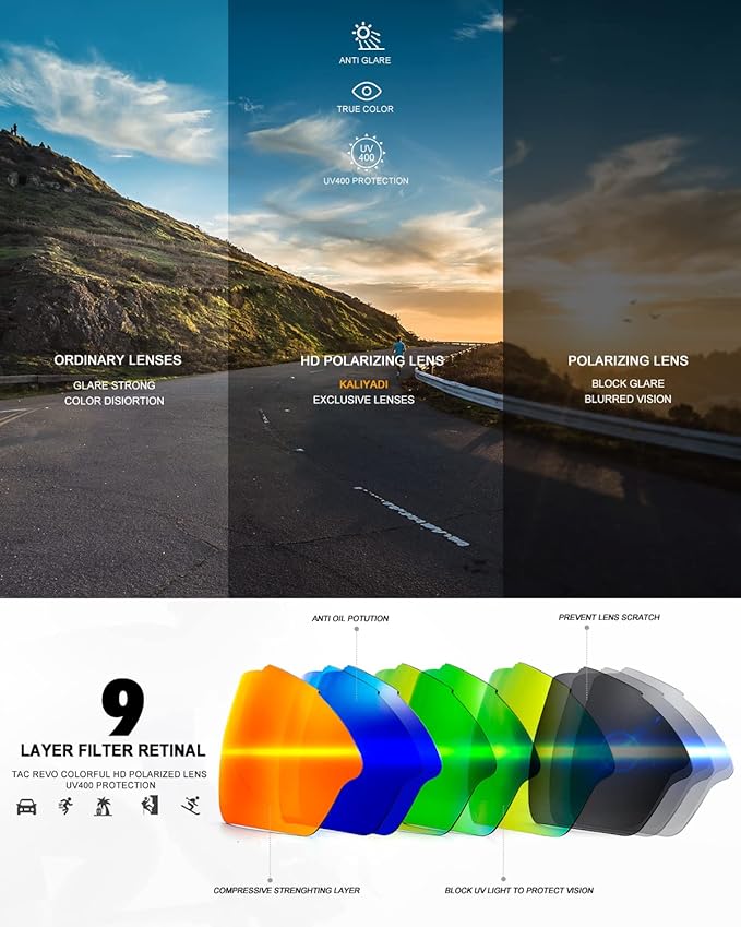 • 😎 Protection and Clarity 📢 KALIYADI sports polarized sunglasses men are designed with the maximum attention to protect your eyes during outdoor activities. The polarized lenses effectively reduce glare, enhancing clarity and providing optimal sight. Whether you're cycling, running, or playing sports, these sunglasses men ensure clear and unobstructed sight, allowing you to fully focus on your performance.