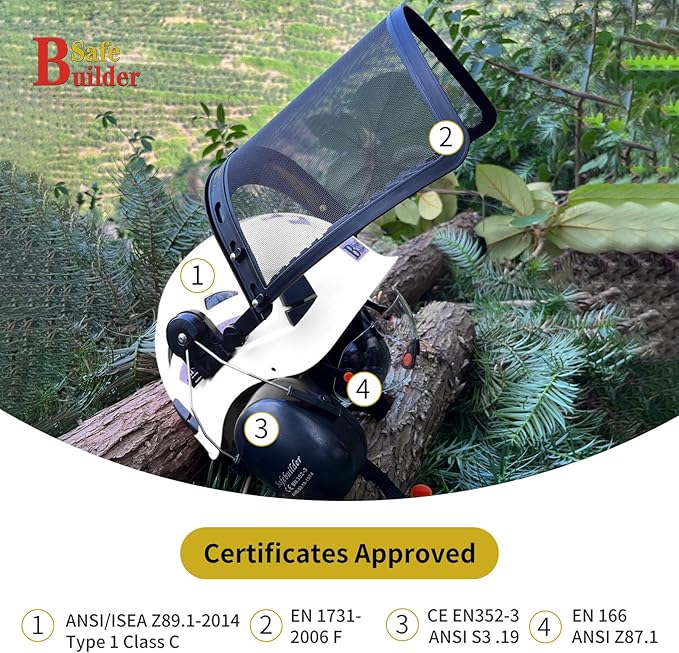 - 【Certificates Approved】: SAFEBUILDER Work Hard Hat meet ANSI Z89.1-2014 ,Type 1 Class C Standards,The visors with CE EN166 & ANSI Z87.1 Approved. The Ear Protector Meet EN 352-3,ANSI S3.19-1974.Face Mesh Shield Meet EN 1731-2006 F.