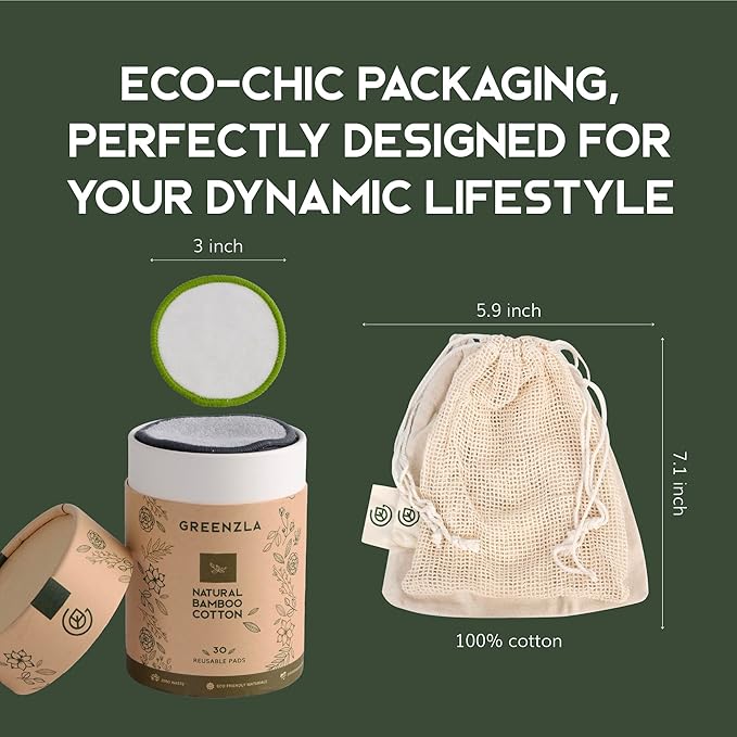 Greenzla Reusable Makeup Remover Pads, Washable Bamboo Cotton Rounds with Mesh Laundry Bag, Travel Pouch, Pad Holder - Reusable Cotton Rounds for All Skin Types - Perfect for Face Care, 30 Pack