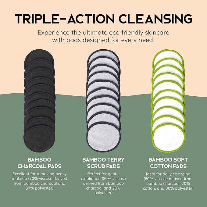 - Triple the Power. Prepare to face the day with three in one skincare essentials. Each set includes 10 terry pads for exfoliating, 10 soft cotton pads for cleansing, and 10 charcoal pads for removing makeup.