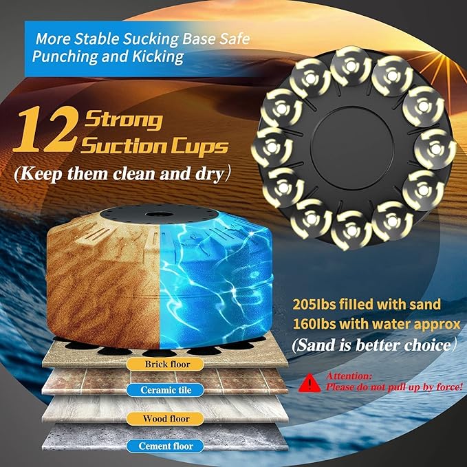 - 【Super Solid Base with Suction Cups】 Featuring a round base with a diameter of 19.7 inches, this punching bag provides easy roll relocation. The base is securely held in place by 12 strong suction cups, ensuring stability during intense training sessions. When filled with sand, the punching bag with a stand weighs up to 205 pounds for maximum durability. It stands at approximately 70 inches (176cm) tall.