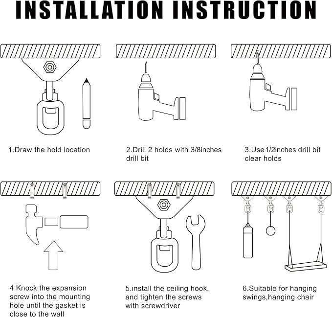 - Widely used in WOOD and CONCRETE : Our swing hardware provides 2 SCREWS for WOOD and 2 EXPANSION BOLT for CONCRETE, Perfect for Ceiling, Punching Bag, Porch Swing, Hammock, Swing Chair, Ring, Yoga Swing, Boxing Equipment, etc.